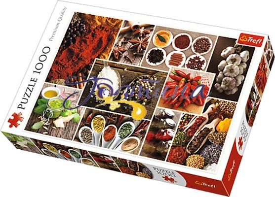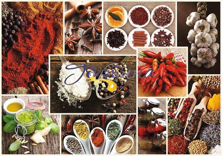 Пазли на 1000 елементів із зображенням у вигляді колажу у язанки часнику та червоного перцю, імбиру, мускату, паличок кориці, а також інших запашних прянощів. У складеному вигляді розмір картинки становить 68х48 див.