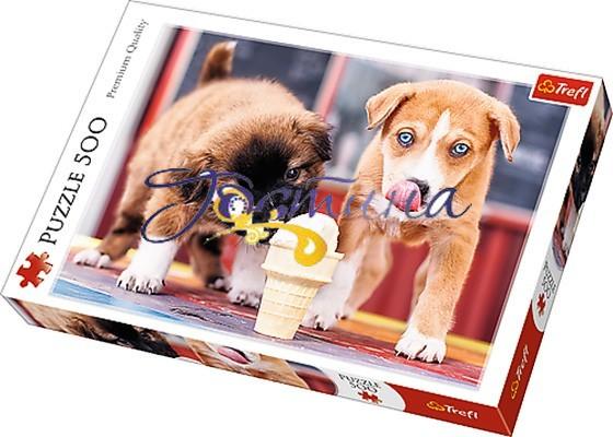 Пазли на 500 елементів із зображенням двох маленьких цуценят, що ласують морозивом. У складеному вигляді розмір картинки становить 48х34 див.