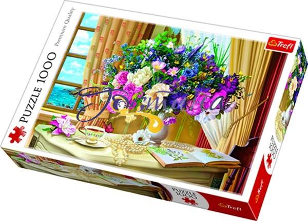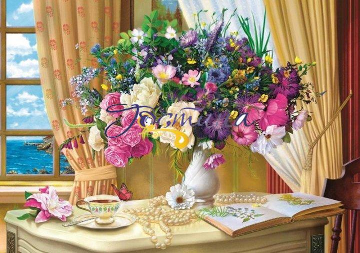 Пазли на 1000 елементів з зображенням чудового натюрморту із літніх запашних квітів. У складеному вигляді розмір картинки становить 68х48 див.