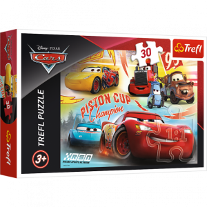 Пазли на 30 елементів з персонажами нового анімаційного фільму Уолта Діснея "Тачки-3", зображених у вигляді колажу. У складеному вигляді розмір картинки становить 20х27 см. Високу якість, насиченість кольорів та безпеку при укладанні пазлів забезпечує спеціальний глазурований (каландрований) картон, який відбиває світло та покритий екологічними фарбами.
