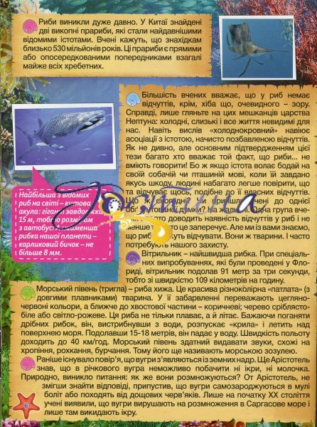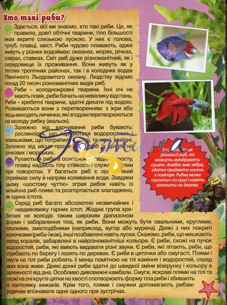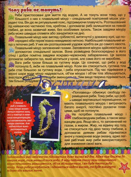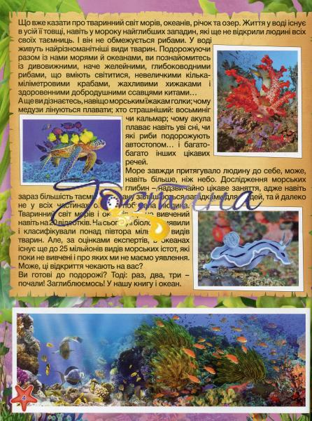 Ця чудова книга познайомить вашу дитину з дивовижним підводним світом: рибами та ссавцями, молюсками та земноводними, мешканцями річок і морів. Пізнавальні тексти, незвичні факти, яскраві фотографії допоможуть юному досліднику дізнатися багато цікавого та корисного про звички підводних мешканців, їх середовище проживання, харчування, особливості полювання, захисту і багато іншого. На сторінках видання ваша дитина зустрінеться з найбільшими і найменшими, найшвидшими і найнебезпечнішими, найпривітнішими і найнезвичайнішими тваринами нашої планети. Книга стане справжнім подарунком для допитливої дитини.Формат А4