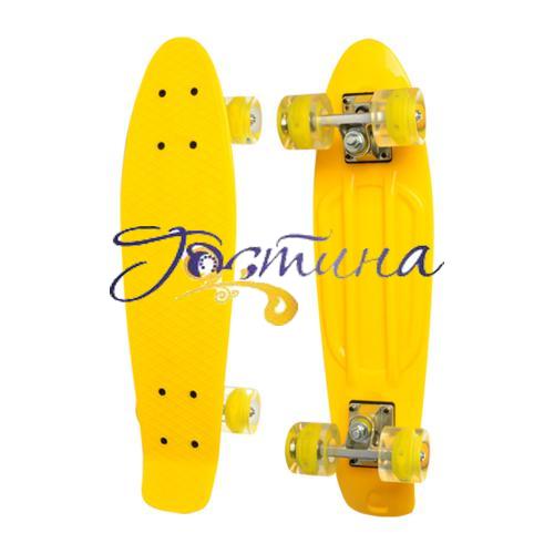 Пластмасовий пенні борд з колесами які святяться MS 0848-5 - був придуманий як альтернатива дерев'яному скейтборду. Стандартно пенні борди йдуть 27, 22 дюймів, з колесами діаметр 59 мм, жорсткість 78А, підшипники АВЕС7. Пенні борд був створений як дешева альтернатива скейту, для їзди в міському середовищі.