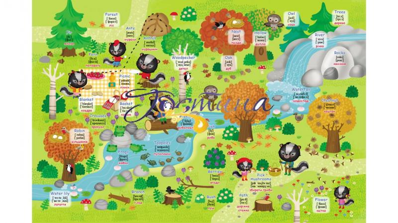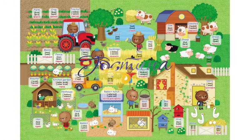 Перша книга англійської мови для вашого малюка. Проілюстровано понад 300 слів із перекладом. У книжці 12 тем: - На фермі, - У лісі, - Овочі, фрукти і ягоди, - Тварини, - Дитячий садок, - У парку, - Цифри, форми, кольори, - Розваги та спорт, - Професії, - У супермаркеті, - Моя родина, - Орієнтуємося у просторі.