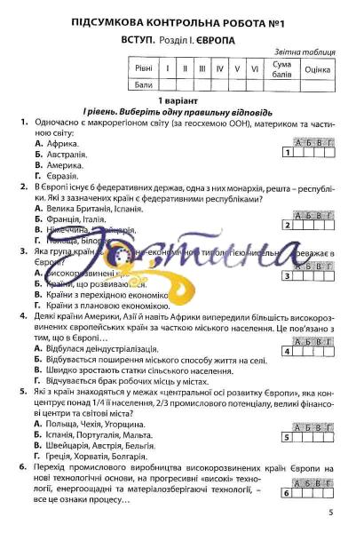 У зошиті пропонуються підсумкові контрольні роботи з географії для 10 класу у формі тестових завдань різних рівнів, теоретичних запитань, завдань з контурною картою, географічних задач. Зміст комплексних контрольних робіт відповідають чинній навчальній програмі. Розроблені завдання допоможуть школярам підготуватись до державної підсумкової атестації з географії. Посібник розрахований на учнів загальноосвітніх навчальних закладів та вчителів.