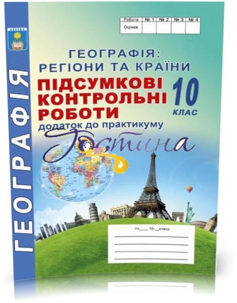 У зошиті пропонуються підсумкові контрольні роботи з географії для 10 класу у формі тестових завдань різних рівнів, теоретичних запитань, завдань з контурною картою, географічних задач. Зміст комплексних контрольних робіт відповідають чинній навчальній програмі. Розроблені завдання допоможуть школярам підготуватись до державної підсумкової атестації з географії. Посібник розрахований на учнів загальноосвітніх навчальних закладів та вчителів.