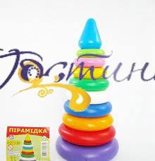 Класична весела пірамідка з кольоровими кільцями, які потрібно нанизувати на вісь.Суть гри полягає в тому, що малюк повинен надіти на підставу диски з отворами посередині. До верху діаметр елементів звужується і закінчується конструкція деталлю у вигляді конуса.В іграшці поєднуються різні кольори, що робить її дуже яскравою і привабливою для дитини. Гра допоможе розвинути дрібну моторику рук, логічне й образне мислення. У сітці 9 кілець.