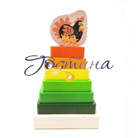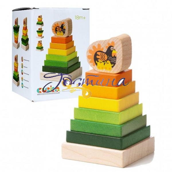 Дерев'яна пірамідка. Кубики українського виробництва, еко-іграшка з карпатського дерева для дітей віком від 2-х років. Дуже якісна, міцна, яскрава та безпечна, пофарбована якісною фарбою. Пірамідка складається з 8 різнокольорових деталей, що мають різну форму та розміри та не мають гострих кутів. Іграшка допоможе дитині познайомитися з квітами, розвивати моторику рук та логічне мислення, навчитися розрізняти геометричні форми.