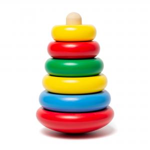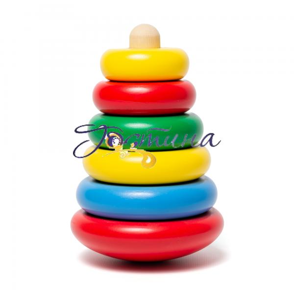 Пірамідка “Максі” – оригінальна пірамідка з шести досить великих елементів для дітей молодшого віку, що допоможе покращити сенсомоторну координацію рухів, вдосконалити систему “око-рука”, гнучкість кисті, глазомір, посидючість, концентрацію уваги. Така іграшка буде незамінною при підготовці руки дитини до письма. Пірамідка має товстий стержень діаметром 2 см та нижній елемент в формі неваляйки. Розмір: 12x12x18cm. Матеріал: дерево, пофарбоване безпечними яскравими фарбами на водній основі.