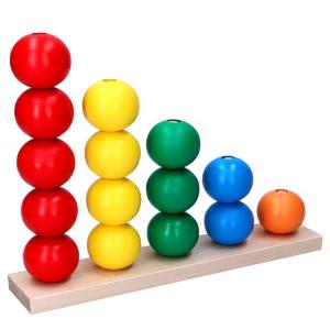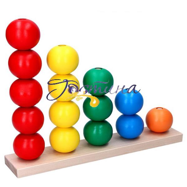 Дерев'яна пірамідка з різнокольоровими деталями-кульками, які потрібно нанизувати на штирі. Нанизуючи вчимося рахувати.