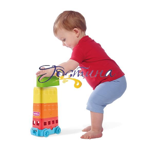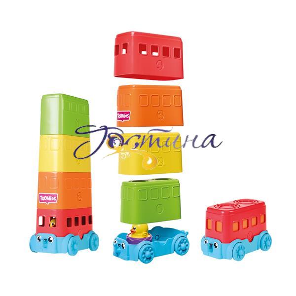 Автобус Toomies – це оригінальна пірамідка з барвистими великими елементами, зручними для маленьких рук. Діти тренують мислення, сортуючи і зіставляючи, складаючи і розкладаючи всі частини. Ще можна запам'ятовувати кольори, рахувати поверхи і придумувати, куди поїде курча на цей раз, розвиваючи уяву та емоційний інтелект у захопливих сюжетно-рольових іграх.