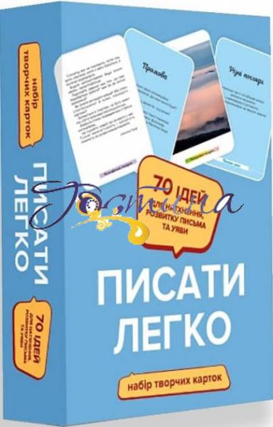 Пропонуємо особливий інструмент для написання текстів та розвитку уяви! Творчі картки «Писати легко» від Ольги Андріяшко — це 10 тижнів та 70 завдань для розвитку вашої креативності, сторітелінґу, творчого та терапевтичного листа. Не бойтесь, що ви ніколи не писали вірші чи твори, що ви не письменник чи філолог… З цими картками ви зможете все. Бо в них точно живе Натхнення. Наййдуться слова, знайдуться образи, народитися щось дуже цінне для вас. А хіба це не чудово. Тягніть картку – Натхнення вже зачекалося!