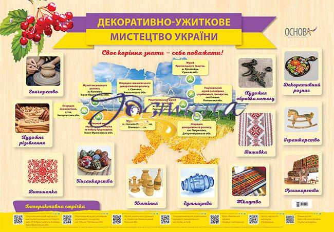 Плакат висвітлює віді декоративно-ужиткового мистецтва України: • Гончарство; • Писанкарство; • Вишиванка; • Ткацтво; • Плетіння тощо. Загалом 12 видів мистецтва з наочними прикладами. Також плакат містить інформацію щодо музеїв мистецтв по всій Україні. Інтерактивна стрічка з QR-кодами містить посилання на сайти та сторінки музеїв, задля кращого ознайомлення із витворами народного мистецтва України. Призначено для класних керівників; завучів з навально-виховної роботи; вчителів історії; вчителів трудового навчання та мистецтва; вчителів українознавства. Для оформлення класу, позакласних заходів національно-патріотічної тематики, тематичних уроків.