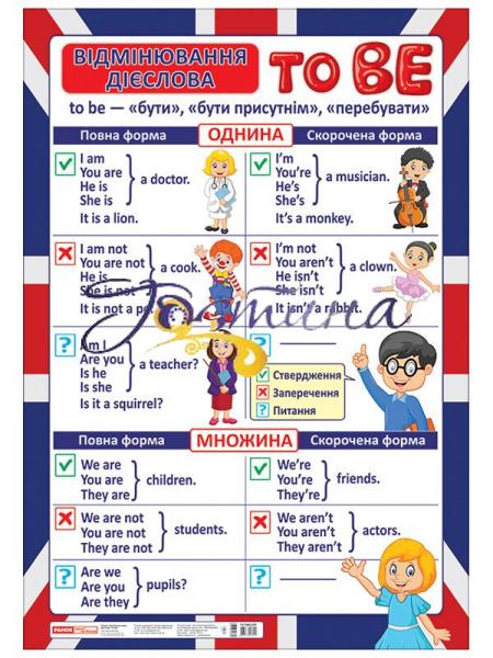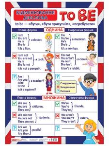 Плакат відмінювання дієслова to be обов’язковий для кабінетів англійської мови. Дуже важливо мати його перед очима на початку вивчення англійської. Знати відмінювання дієслова to be – це практично вивчити основу мови. З цього дієслова починається знайомство й не обходиться жодна розмова. Використовуємо у дитячих садочках, школах і спеціалізованих навчальних закладах або гуртках з англійської.