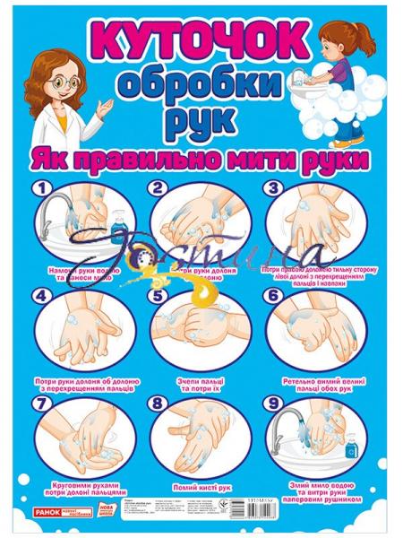 Під час пандемії коронавірусу плакат «Куточок обробки рук» стане в нагоді кожному вчителю та вихователю. Створіть безпечні умови дітям під час навчання та захистіть здоров’я дітей та колективу. Плакат буде нагадувати дітям та дорослим про необхідність дотримання правил гігієни, які допоможуть зберегти здоров’я. Великий розмір: 70х50 см.