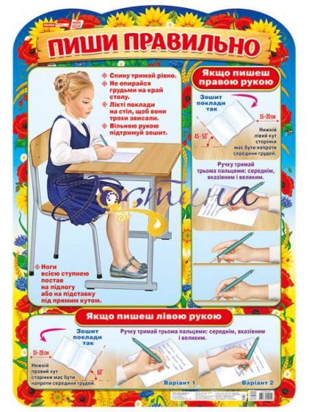 Плакат «Пиши правильно» за програмою НУШ призначений для використання у початкові школі та вдома. Це помічник педагогам та батькам у формуванні правильної постави у дітей старшого дошкільного й молодшого шкільного віку. Також плакат -пам’ятка вчить триманню письмової приналежності та розміщенню зошита при виконанні завдань. Розрахований на дітей, які пишуть як правою, так і лівою рукою. Плакат фігурний, надрукований на цупкому картоні, виконаний в етностилі. Така наочність гарно доповнить дитячу кімнату чи шкільне приміщення.