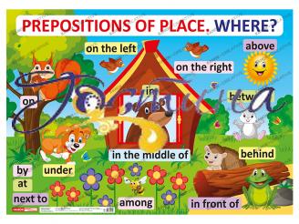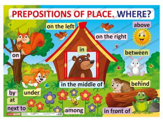Краще запам’ятати прийменники місця в англійській мові допоможе демонстраційний матеріал. А саме, яскравий плакат з проілюстрованими прикладами місця. Завдяки цьому запам’ятовування значень стає простим і легким