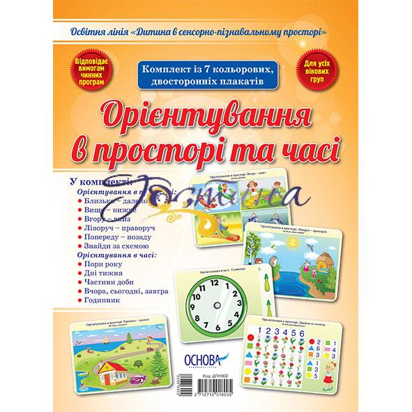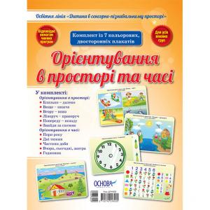 Комплект із 7 кольорових, двосторонніх плакатів. У комплекті: Орієнтування в просторі: Близько - далеко Вище - нижче Вгору - вниз Лівоуч - праворуч Попереду - позаду Знайди за схемою Орієнтування в часі: Пори року Дні тижня Частини доби Вчора, сьогодні, завтра Годинник