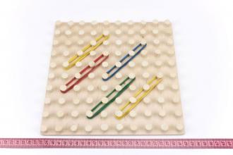Розмір 24,5х24,5х1,8 см. Математичний планшет «Геометричні резиночки» сприяє психосенсомоторному, когнітивному (пізнавальному) розвитку, а також розвитку творчих здібностей. Розвиває пам'ять, координацію, уяву. Розвиток уяви, в свою чергу, сприятиме отриманню творчих результатів у всіх видах діяльності.