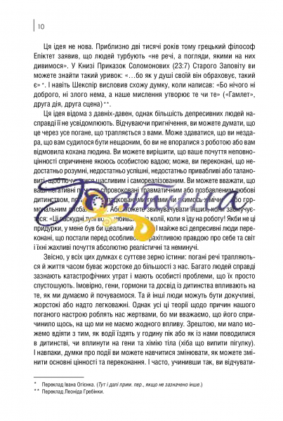 Почуваєтеся невдахою? Новий день приносить лише нові неприємності та безвихідь? Хочеться втекти від проблем? Усі ці почуття — передвісники депресії. Однак — не панікувати! Вони так і залишаться передвісниками, якщо ви скористаєтеся методикою лікаря Девіда Бернса — суперфахівця з когнітивно-поведінкової терапії. Він не дає депресії жодних шансів!