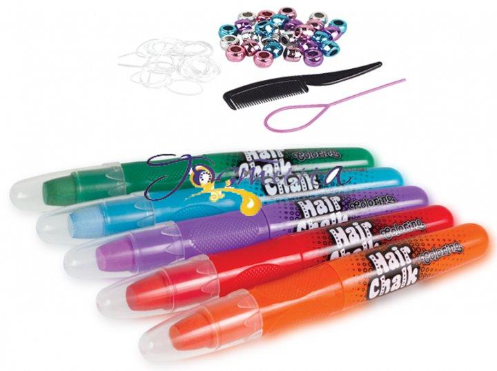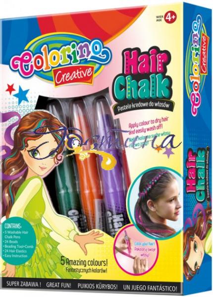 Подарунковий набір для декору волосся Colorino складається з крейди для волосся у формі олівців, 5 насичених стандартних відтінків, гребінця, 24 гумочки, 24 намистини та гачок для вплетення у волосся. Крейда для волосся Colorino - ідеальний варіант для тимчасової зміни стилю без шкоди для волосся. З ним легко фарбувати пасма, виділяти окремі локони, зробити зачіску оригінальнішою.