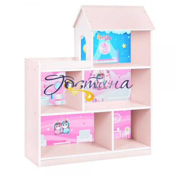 Поличка-будиночок HB-305-1-2 стелаж, Ш96-в117-г34см, висота полиць 30см, рожево-білий, єдиноріг. Матеріал - ДСП.