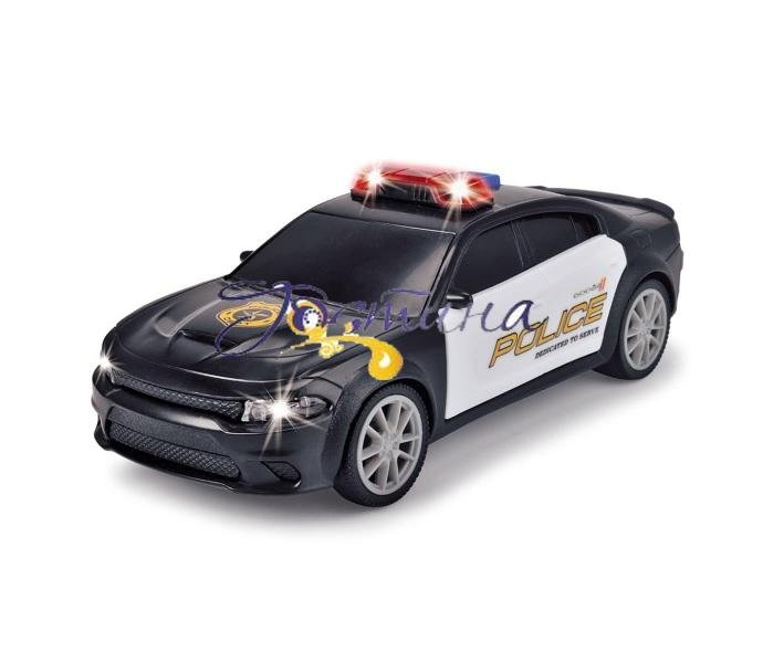 повнорозмірну машину: колеса з великим радіусом, широка посилена рама бампера, фари, дзеркала заднього виду. Іграшка стане помічником в організації безлічі захоплюючих сюжетних ігор. Особливості поліцейської машини Dickie Toys Dodge Charger: механізм вільного ходу коліс дозволить машинці їздити без перешкод;