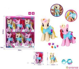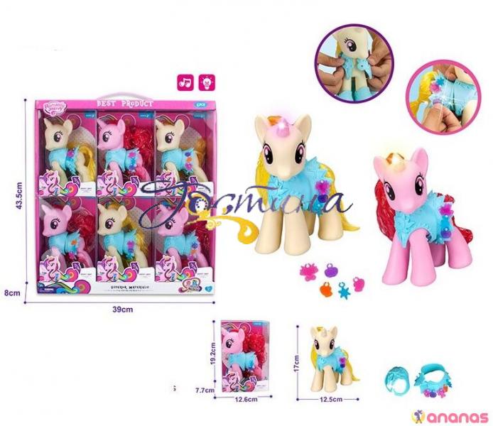 Іграшка має звуковими і світловими ефектами. Якщо натиснути на кнопку на животику поні, почне наспівувати пісеньку,