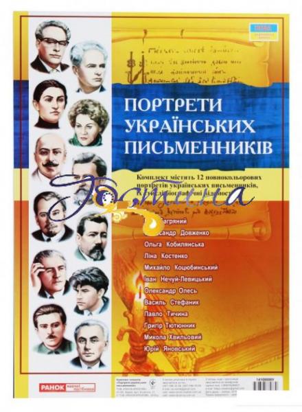 Комплект містить 12 повнокольорових портретів відомих українських письменників.