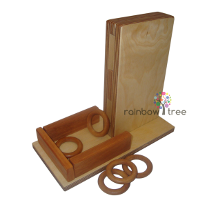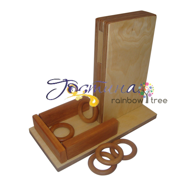 Опис матеріалу: Матеріал возращаться кільця складається з закріпленої вертикально коробочки з двома отворами. Коробочка закріплена на приймальні платформі з обмежуючими бортиками. До матеріалу додаються дерев'яні кільця.