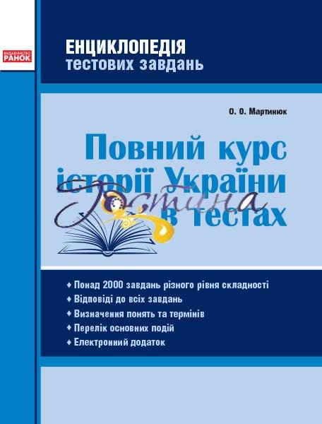Повний курс історії України в тестах – якісне видання, що допоможе широкому колу користувачів в опануванні шкільного курсу з історії. Посібник може застосовуватись вчителями в процесі навчання для узагальнення знань та формування навичок розв’язання тестових завдань. Також посібник пропонується для використанням школярами як джерело додаткових знань та структурованої інформації з історії. В посібнику включені тестові завдання з історії України 5 клас – 11 клас, що дозволяє освіжити знання з початку вивчення предмету і підійде для абітурієнтів для підготовки до ЗНО або інших вступних випробовувань. Використання посібника буде в нагоді для підготовки до олімпіад.