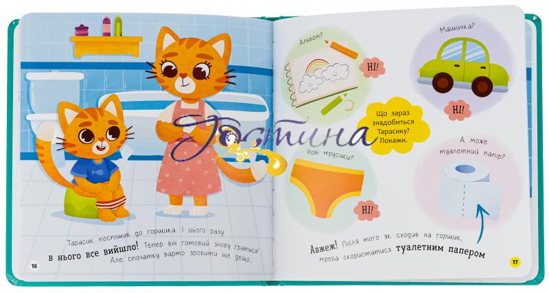 Ця інтерактивна книжка підкаже батькам, як в ігровій формі допомогти дитині звикнути до горщика. Разом з милим героєм ваш малюк засвоюватиме важливі навички: запам’ятає правильну послідовність дій — зняти штанці, сісти на горщик, скористатися туалетним папером і вимити руки. А якщо раптом не вийшло — не треба засмучуватися, варто спробувати ще. Книжка відповість на найпоширеніші дитячі запитання: навіщо йти на горщик перед сном і прогулянкою, що робити, якщо закортіло в туалет на вулиці чи в крамниці.