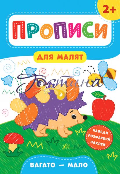 Це видання допоможе засвоїти й опрацювати поняття «багато — мало». Виконуючи завдання, малюк навчиться визначати та співвідносити між собою кількість предметів, наведе пунтирні лінії, розфарбує малюнки та попрацює з наліпками. Таким чином дитина підготує руку для майбутньої роботи з прописами для дошкільнят. Видання призначене для спільної роботи дітей віком від двох років з батьками.