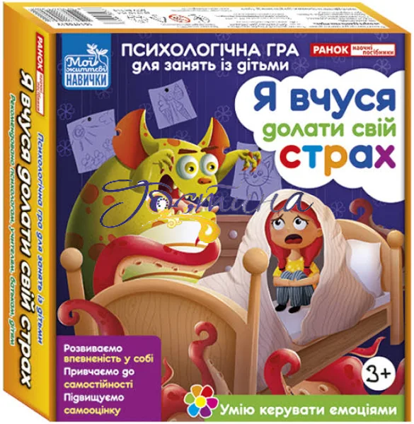 Гра містить: картки із розв’язанням проблем – 20 шт., покрокову інструкцію з порадами – 1 шт. Що робити, якщо дитина боїться... темряви, невідомих створінь, навіть солодкої вати? Якщо ви помічаєте, що ваша дитина чогось боїться, пограйте з нею в гру «Я вчуся долати свій страх». Картки, що містяться в наборі, пропонують цікаві і веселі вправи, які допоможуть вашій дитині наважитися та подолати свої страхи. Дитина, яка має змогу вільно розповісти дорослим про свої страхи, швидше їх подолає. Завдяки нашій грі діти зможуть позбутися своїх страхів та навчитися контролювати негативні емоції