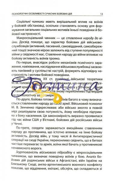 У книзі акумульовано сучасні підходи до розуміння психологічних особливостей сучасних бойових дій та їхнього впливу на бойову діяльність військовослужбовців. Описано форми, методи та засоби, які може застосовувати командир, щоб підтримати належний морально-психологічний стан особового складу в різних ситуаціях бойової діяльності. Представлений у книзі матеріал орієнтований на прикладне застосування у військових підрозділах. Призначена для курсантів, офіцерів і викладачів вищих військових навчальних закладів, командирів, фахівців морально-психологічного забезпечення, а також усіх, хто цікавиться проблематикою військової психології.