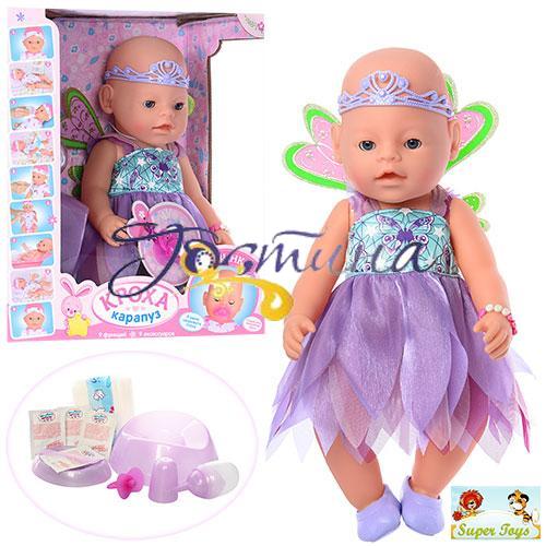 Лялечка виконує 9 основних життєвих функцій, які надають їй схожість із справжнім малюком: п'є з пляшки, робить в пелюшки, їсть кашку, ходить на горщик, пищить, плаче, рухає ручками та ніжками, її можна купати, і ще вона вміє відкривати і закривати очі .  Маленька 'мамочка' може її нагодувати, посадити або покласти в коляску, вивезти на прогулянку, викупати, переодягнути, пограти з нею, посадити на горщик, вкласти спати в ліжечко - тобто, повторити всі дії своєї справжньої мами! Подібні рольові ігри допомагають дитині правильно розвиватися, логічно мислити, вчитися доброті і терпінню. Пупс 42 см 9 функцій багато аксесуарів коробка 32,5-38-20см