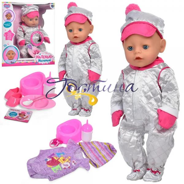 Пупс M 4649 I UA 45см, звук, горщик, пляшечка, соска, 2 види вбрання/посуд, туфлі, бат табл, в кор-ке. Матеріал: пластмаса + тканина. У цій серії ляльок лінійки «Маленькі-Миленькі» функція «п'є-писає» відсутня