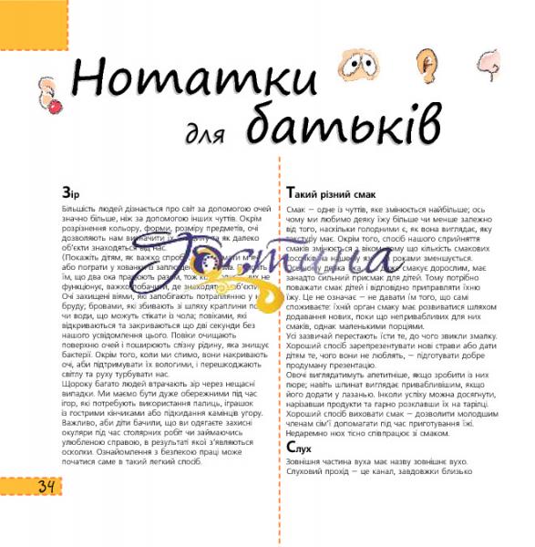 Як це класно — бачити, чути... пізнавати наш чудовий світ! На сторінках цієї книги хлопчики та дівчатка досліджують свої п'ять органів чуття: зір, слух, запах, дотик і смак, граючись на природі, слухаючи музику, готуючи їжу на кухні та займаючись багатьма іншими захоплюючими справами. Розділ наприкінці книги містить різні цікавинки та поради для батьків.