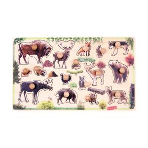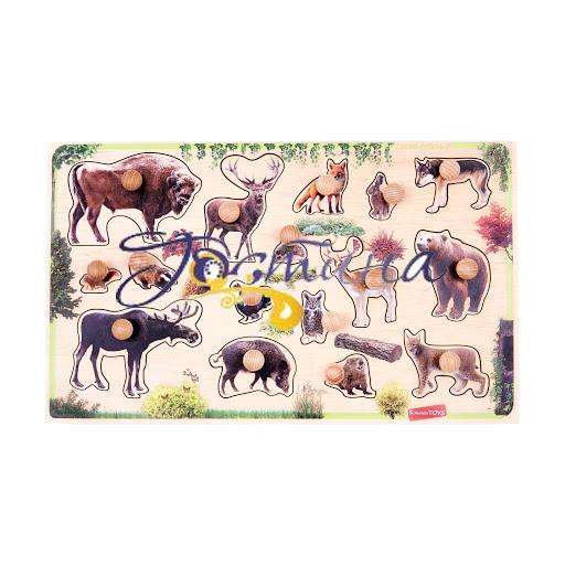 Іграшка - рамка вкладиш «Мешканці лісів» розвиває велику моторику, координацію рухів, гнучкість кисті, окомір, посидючість, концентрацію уваги. Матеріал - деревина, пофарбована стійкими європейськими, яскравими фарбами на водній основі. Рамка великого розміру, фігури досить великі, мають ручки. Розмір: 500х300х35мм.