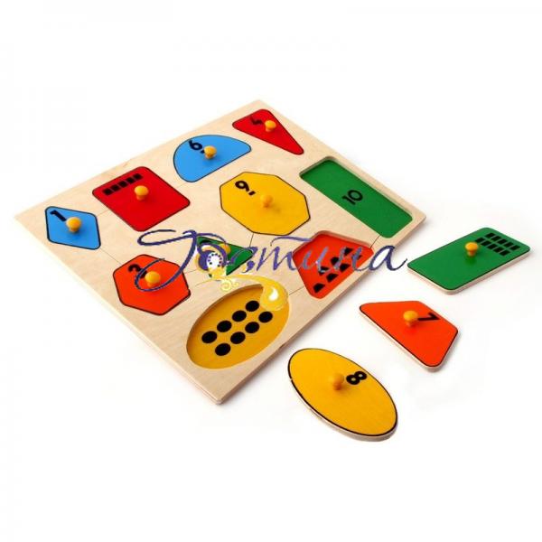 Геометричні фігури МонтессоріДерев'яний планшет з 10 різнокольоровими виймаються вкладишами у вигляді геометричних фігур. Кожен вкладиш забезпечений зручною ручкою. Колір виїмок відповідає кольору вкладки-фігури. Кількість точок на виїмці або вкладиші і цифрах на виїмці або вкладиші - відповідає.   Направлено на: розвиток логічного мислення, активного словника, пізнавальної активності, наочно-дієвого мислення, мовлення;формування сенсорних еталонів кольору, величини і форми;формування предматематичних уявлень, навчання рахунку.