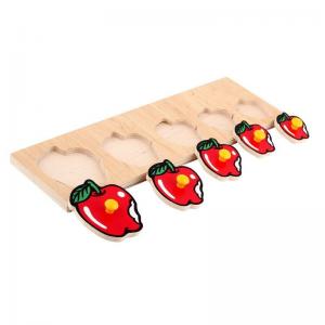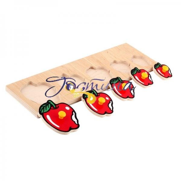 Дерев'яна панель, на якій розміщено п'ять яскравих вкладишів різного розміру (від меншого до більшого). Всі вкладиші забезпечені для зручності жовтими ручками-кнопочками.