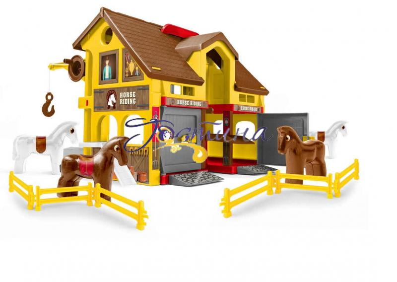 Стайня Play House - це набір, що відтворює життя на справжній конефермі, з просторою стайнею і загорожею для коней, транспортним ліфтом і поверхом для працівників конезаводу і пунктом прокату кінного спорядження. До набору входить будинок із дверцятами, що відчиняються, транспортний підйомник, 4 коні, 6 огорож загороди загороди, 2 ємності для води та їжі, смуга перешкод, підйомний кран для перевезення сіна, під'їзні шляхи та набір із 34 наліпок для самоклейки. Стайня Play House пропонує безліч можливостей для гри як хранителів кінної ферми, щоденної виїздки та годування коней, щоденної турботи про їхнє щастя, оренди спорядження для верхової їзди та управління школою верхової їзди. Усі елементи стайні Play House виготовлені з міцних матеріалів, безпечних для дітей від 3 років. Будинок додатково обладнаний ручкою, встановленою на даху, завдяки якій його можна легко переміщати в будь-яке місце.