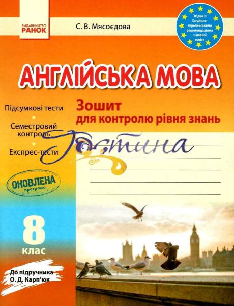 Зошит для контролю рівня навчальних досягнень учнів пропонує підсумкові тести, відповідні тематичними розділами відповідного підручника, семестрові тести з читання, аудіювання, письма, мови, а також експрес-тести. Всі тести представлені в двох варіантах. За допомогою зошити можна проводити поточний, підсумковий і семестровий контроль рівня знань учнів 8 класів з англійської мови. Видання укладено відповідно до чинної програми з іноземних мов. Зошит для контролю рівня знань містить • підсумкові тести; • семестрові тести; • експрес-тести.