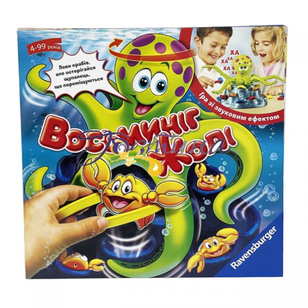 Чудова гра, переможцем якої стане найвправніший і вмілий! 20 різнокольорових крабиків і веселий великий восьминіг грають з вами у хованки. Для початку гри необхідно встановити восьминога в центрі ігрового поля, потім перший гравець натискає на восьминогу голову і ви чуєте чудові звуки арфи. Жолі починає обертатися, а його руки рухаються вгору та вниз. Гравцю необхідно за допомогою щипців витягнути крабика, не торкнувшись щупалець восьминога. Якщо гравець торкнеться щипцями до однієї з лап восьминога, той почне шалено реготати. З кожним новим ходом напруга зростає! Переможе у грі той, хто найшвидше збере крабиків свого кольору. Така іграшка відмінно розвиває уважність, моторику та координацію рухів.