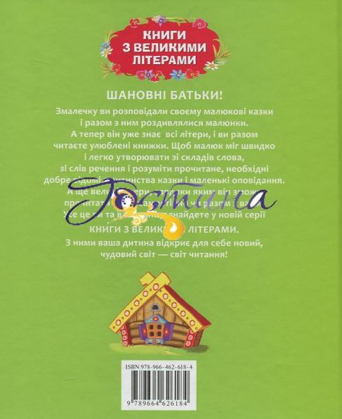 До Вашої уваги новинка — серія «Книги з великими літерами»! Змалечку батьки розповідали малюку казки і разом з ним роздивлялися малюнки, а тепер він вже знає всі літери, і ви разом читаєте улюблені книжки. Щоб малюк міг швидко і легко утворювати зі складів слова, зі слів речення і розуміти прочитане, необхідні добре відомі з дитинства казки і маленькі оповідання. А ще великі літери, завдяки яким він зможе прочитати текст самостійно чи разом з вами. Усе це малюк знайде у цій серії — з нею для нього відкриється новий чудовий світ — світ читання!