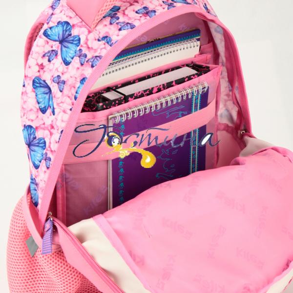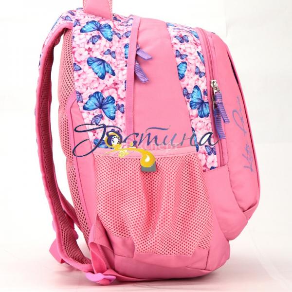 Рюкзак для дівчаток молодшої та середньої школи виконаний з міцного поліестеру рожевого кольору із зображенням блакитних метеликів, має рожеву підкладку.