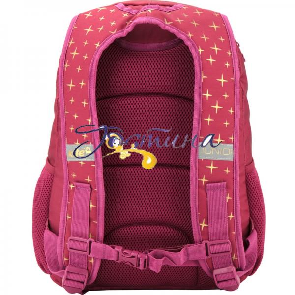 Рюкзак KITE 855 Junior-2 K17-855M-2. Рюкзак для дівчаток молодшої та середньої школи виконаний з міцного поліестеру рожевого кольору із зображенням блакитних метеликів, має рожеву підкладку. Будова рюкзака дозволяє мінімізувати навантаження на дитячий, ще не зміцнілий, хребет. Ущільнена ортопедична спинка з 'дихаючими' подушечками, анатомічні лямки правильної S-подібної форми, нагрудний ремінь сприяють щільному прилягання рюкзака до спини, мінімізують тиск на плечі і хребет дитини, дарують відчуття комфорту і легкості. Рюкзак складається з двох просторих відділень, 1 переднього, 2 бокових кишень і кишені для пляшки. Внутрішні роздільники для книг і зошитів в основному відділенні дозволяють правильно організувати простір в рюкзаку. Передня кишеня оснащений зручним органайзером, що дозволяє систематизувати і легко знаходити в рюкзаку шкільне приладдя та особисті речі дитини.Регульовані лямки і невелику вагу, всього 615 г, роблять рюкзак комфортним і необтяжливим для дитини.Світловідбиваючі елементи з усіх боків рюкзака забезпечують безпеку на дорозі в темну пору доби.Тканина пройшла складні тести на зносостійкість і розриви, стійка до впливу зовнішніх факторів. Матеріал не вигорає під впливом сонячних променів, зберігає свої властивості і зовнішній вигляд надовго.Фурнітура виконана з якісного матеріалу, замки легко і плавно відкриваються. Матеріал: поліестер Розмір, см: 40х30х18 Вага, г: 615 Обсяг, л: 22