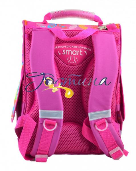Вага: 950 г. Кількість відділів: 1 основний відділ з рухомими роздільниками і еластичною стрічкою, прозора кишеня для розкладу (на клапані рюкзака), передня кишеня на блискавці, 2 бокові кишені. Особливості: ортопедична спинка, регульовані плечові лямки S-подібної форми, прогумована ручка, ручка-петля, світловідбиваючі елементи, якісна фурнітура, ущільнене дно. Ранець можна прати в пральній машині. Розмір 26*34*14 см. Об'єм 12л.