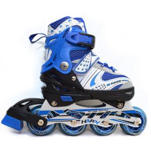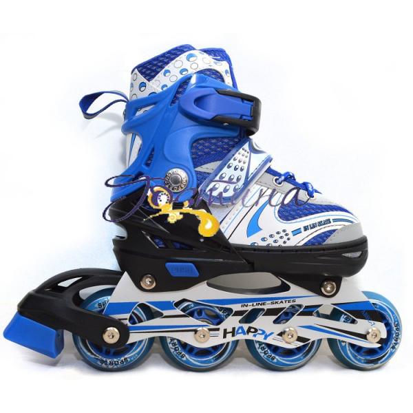 Стильні роликові ковзани з кольоровими колесами від Проффі Roller відрізняється своїм яскравим дизайном і характеристиками, що подобаються, які сприяють комфортному катанню. Завдяки комбінованому черевику нога дитини надійно фіксуватиметься в ньому. Його жорсткість не дасть їй маневрувати, забезпечивши цим легкість в управлінні, а м'який сітчастий матеріал захистить ногу від пошкоджень і дозволить їй дихати. Функція кнопкового регулювання розміру робить ролики універсальними. Це допоможе використати їх довгостроково. Розрахована ця модель на 4 розміри. Висувна система дозволить використовувати одну пару роликів у процесі зростання ноги дитини. Початковий розмір при цьому підійде для ніжки з приблизною довжиною стопи 21,5 см. Устілки в комплекті немає. Кнопковий регулятор надійно зафіксує необхідний розмір в одному положенні і не даватиме йому розсуватися під час катання. Фіксація роликів на нозі досить надія і здійснюється за допомогою пластикової баклі, шнурівки та ременя на липучці. Колеса з поліуретану на підшипниках сприяють плавній, швидкісній та практично безшумній їзді. Переднє колесо роликів при цьому підсвічуватиметься кольоровими вогниками. Характеристики: Тип: розсувні Матеріал коліс – поліуретан