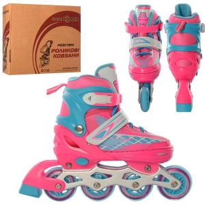 Ролики Profi A 4140-L-PBL (39-42) Рожеві, розсувні, колеса ПУ 70 мм Особливості дитячих розсувних роликів Profi A 4140-L-PBL: роликові ковзани з можливістю регулювання розмірів; можливість регулювання у 4-х розмірах; розмір: 39-42; розмір легко регулюється за допомогою кнопок; устілка 24 см; черевик м'який; мембранна підкладка забезпечує хорошу вентиляцію черевика; зручна застібка-бакля + шнурівка добре фіксують ногу; надійна рама із алюмінію; колеса поліуретанові; яскравий сучасний дизайн.