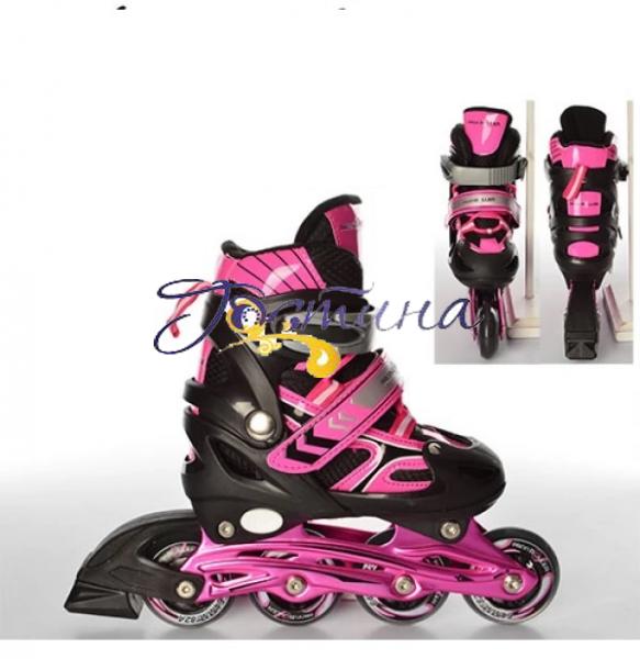 Стильні роликові ковзани з кольоровими колесами від Proffi Roller вирізняються своїм яскравим дизайном і вподобаними характеристиками, які сприяють комфортному катанню. Завдяки комбінованому черевику нога дитини надійно фіксуватиметься в ньому. Його жорсткість не дасть їй маневрувати, забезпечивши цим легкість в управлінні, а м'який сітчастий матеріал захистить ногу від пошкоджень і дозволить їй дихати. Функція кнопкового регулювання розміру робить ролики універсальними. Це допоможе використати їх довгостроково. Розрахована ця модель на 4 розміри. Висувна система дозволить використовувати одну пару роликів у процесі зростання ноги дитини. Початковий розмір при цьому підійде для ніжки з приблизною довжиною стопи 21,5 см. Устілки в комплекті немає. Кнопковий регулятор надійно зафіксує необхідний розмір в одному положенні і не даватиме йому розсуватися під час катання. Фіксація роликів на нозі досить надія і здійснюється за допомогою пластикової баклі, шнурівки та ременя на липучці. Колеса з поліуретану на підшипниках сприяють плавній, швидкісній та практично безшумній їзді. Переднє колесо роликів при цьому підсвічуватиметься кольоровими вогниками. Характеристики: Тип: розсувні Матеріал коліс – поліуретан